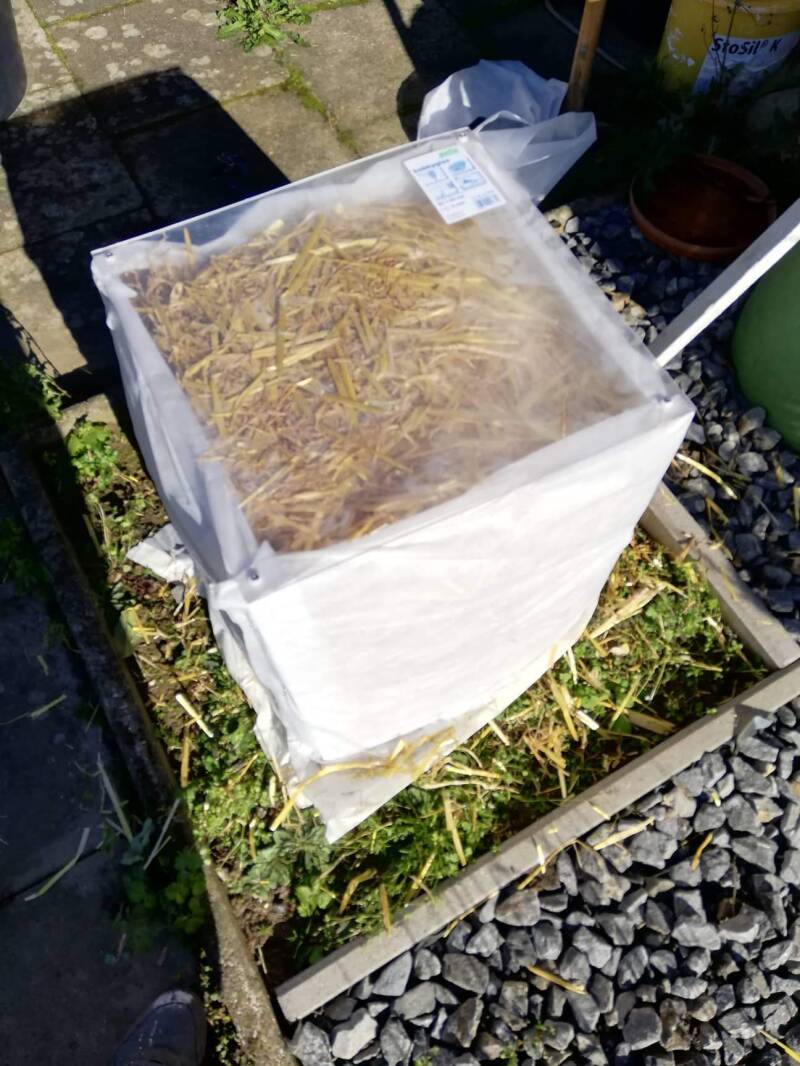 Überwinterung mithilfe Styroporplatten (mit Laub gefüllt):