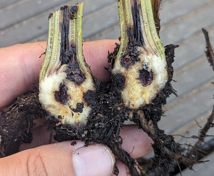 Weit fortgeschrittene Stammfäule. Das Rhizom beginnt abzusterben